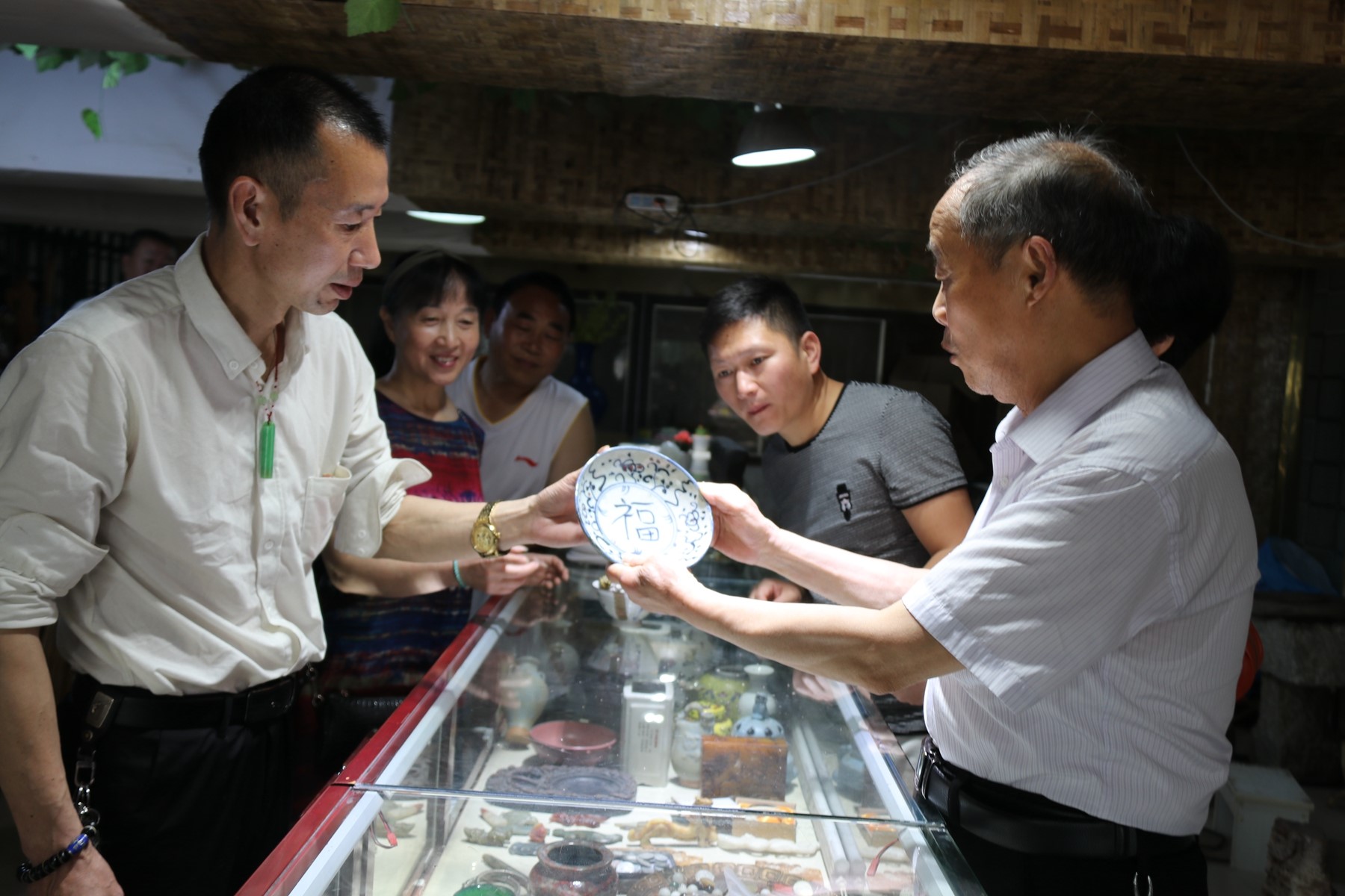在参观中,房县收藏爱好者、交通局75岁退休干部夏光荣指着一个带“福”字的清代青花瓷盘介绍到,古人对文字是很有讲究的,你看福就是左边一个“衣”,右边有“口”有“田”,有衣穿有田种,有吃有穿咋不是“福”呢!这个瓷盘放到当今社会真是好贴切啊!