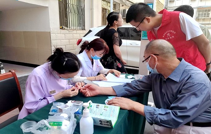 近日,县妇幼保健院医疗志愿服务队志愿者们在物资小区为老人测量血糖、血压。在该院开展的爱心义诊活动中,医护人员现场为儿童进行骨密度测量、口腔、视力检测和指导等;解答群众用药、饮食方面的问题,倡导居民加强自我保健、适当运动、规律生活,让他们在家门口就能享受到便捷的医疗服务。