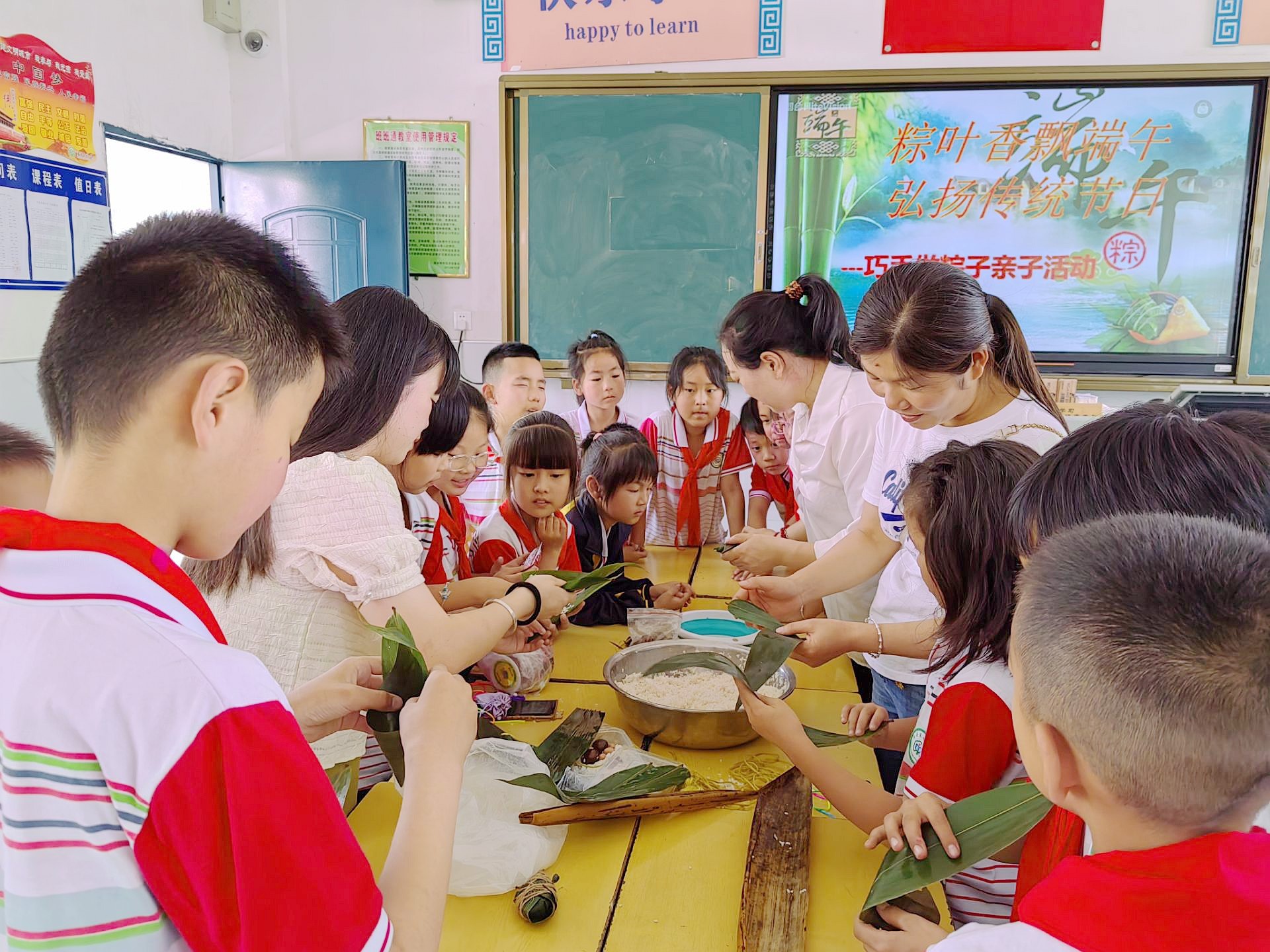 右图:东城小学学生与家长一起包粽子。在该校开展的“感恩端午情,不负少年志”为主题的系列活动中,老师通过视频、图片、童谣、召开端午主题班会等形式,加深学生对端午节的认识,感受端午传统节日文化带来的浓浓温情。 (邓红艳 摄)