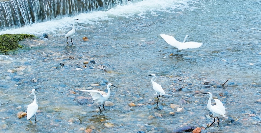 岸绿水清景美 白鹭蹁跹起舞 (张启龙 摄)
