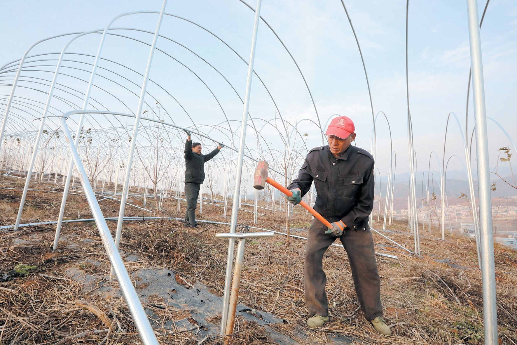 近日,在城关镇八里村樱桃园,当地农民正在搭建智慧避灾温控大棚。入冬以来,该镇积极引导果农为樱桃树搭建避灾温控大棚,有效避免病虫害和自然灾害,推动樱桃产业高质量发展,助力乡村振兴、农民增收。 (张启龙 摄)