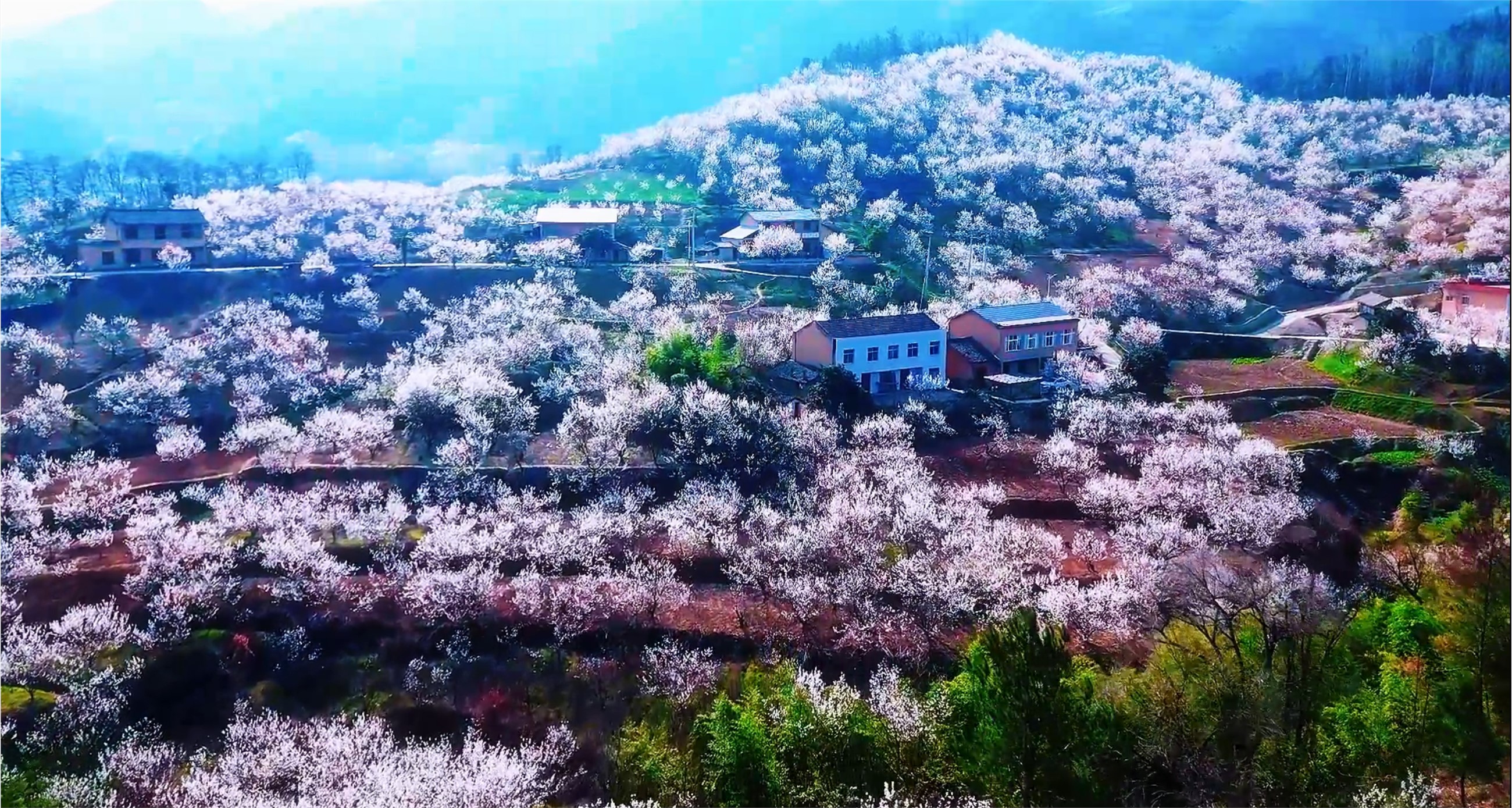 近日,城关镇八里村万亩樱桃花竞相绽放,宛如一片如云似雪的樱花海洋,将山野装点得如梦如幻,吸引大批游客前来踏春赏景,共同感受春日浪漫好风光。(陈锐 摄)