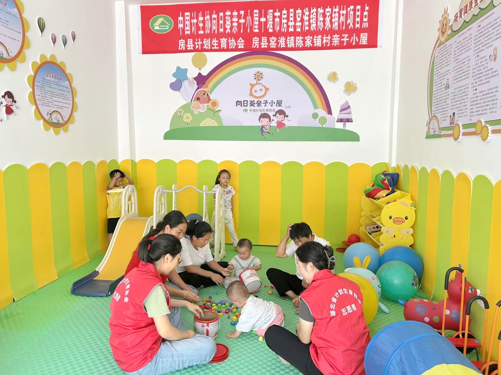 近日,县妇幼保健院在窑淮镇陈家铺村“向日葵亲子小屋”开展科学育儿指导、亲子游戏互动、健康知识普及等活动,把健康服务送到村民家门口,让更多家庭受益。图为工作人员指导家长和孩子互动玩耍。 (王丽 摄)