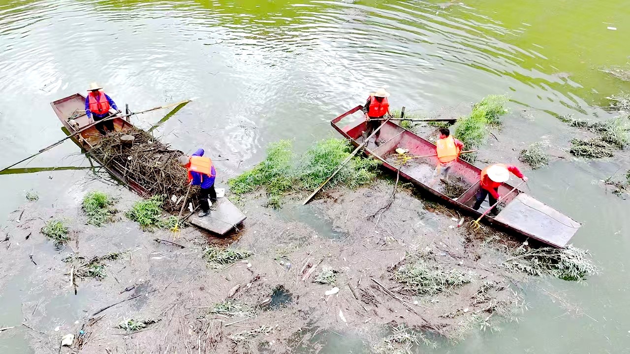 8月上旬,受连续强降雨影响,洪水携带的树枝、高秆作物等垃圾淤积在谭家湾水库,严重影响水域环境。图为当地农民“河湖长”正在打捞水库漂浮垃圾。近年来,我县牢固树立“绿水青山就是金山银山”发展理念,以“河湖长制”为抓手,常态化巡河、全方位摸排、清单式交办,推动水生态环境持续向好。 (张启龙 摄)