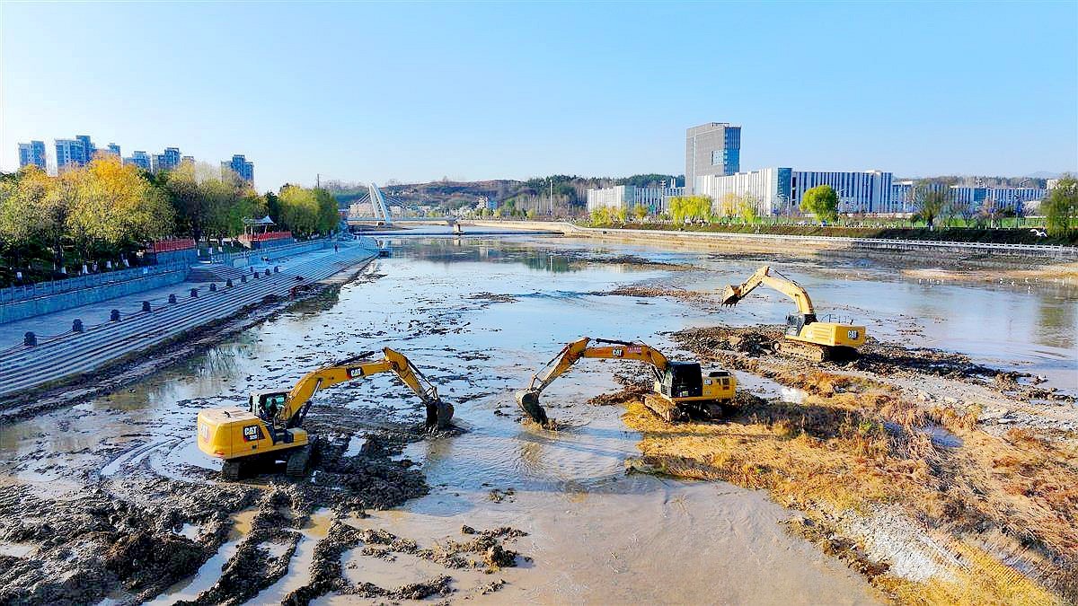 近日,在马栏河城区半岛湾段,挖掘机在清淤疏浚。连日来,我县抢抓冬季枯水期,对城区内的河道进行清淤疏浚和环境治理,提升河道水质,增强河道生态功能,改善人居环境质量。(张启龙 摄)
