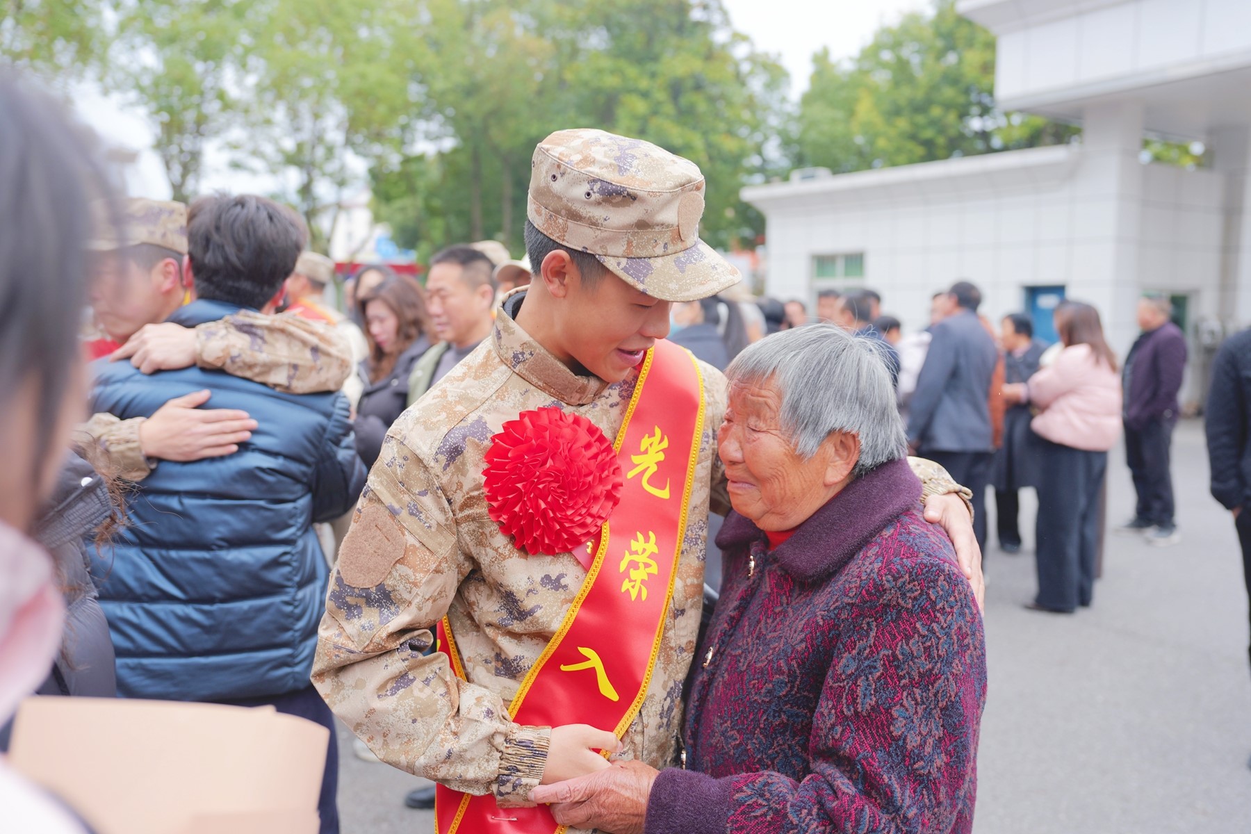 3月19日,我县隆重举行2026年上半年新兵入伍欢送大会。新兵们身披“光荣入伍”绶带,胸戴大红花,精神抖擞、目光坚毅,带着家乡的殷切祝福,把满腔热血转化为强军兴军的实际行动,在广阔军营中建功立业,书写无愧于时代的青春华章。图为新兵与家人拥抱道别。(曹其琪 谢圣 摄)