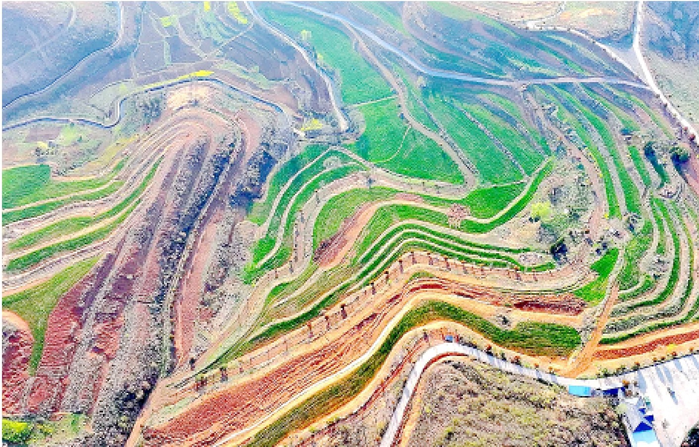 近日,军店镇中村小流域,水平梯田环绕山腰,茁壮的麦苗沃绿田野,孕育着粮食丰收的希望。近年来,我县实施“山、水、林、田、路”综合治理,将“望天田”变身旱涝保收的“饭碗田”,促进农业增效、粮食增产、农民增收。 (张启龙 摄)
